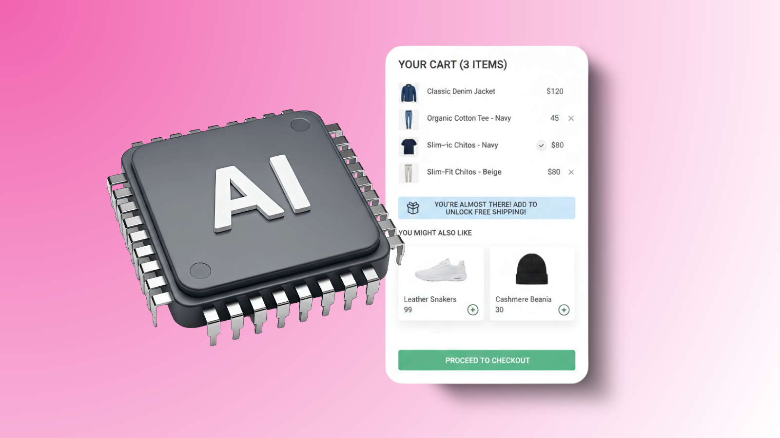 AI can dynamically recommend items based on what’s already in the cart and past upsell performance. These light-touch offers are highly effective because they appear at a low-friction stage, just before checkout, when the customer is emotionally invested and open to enhancement.